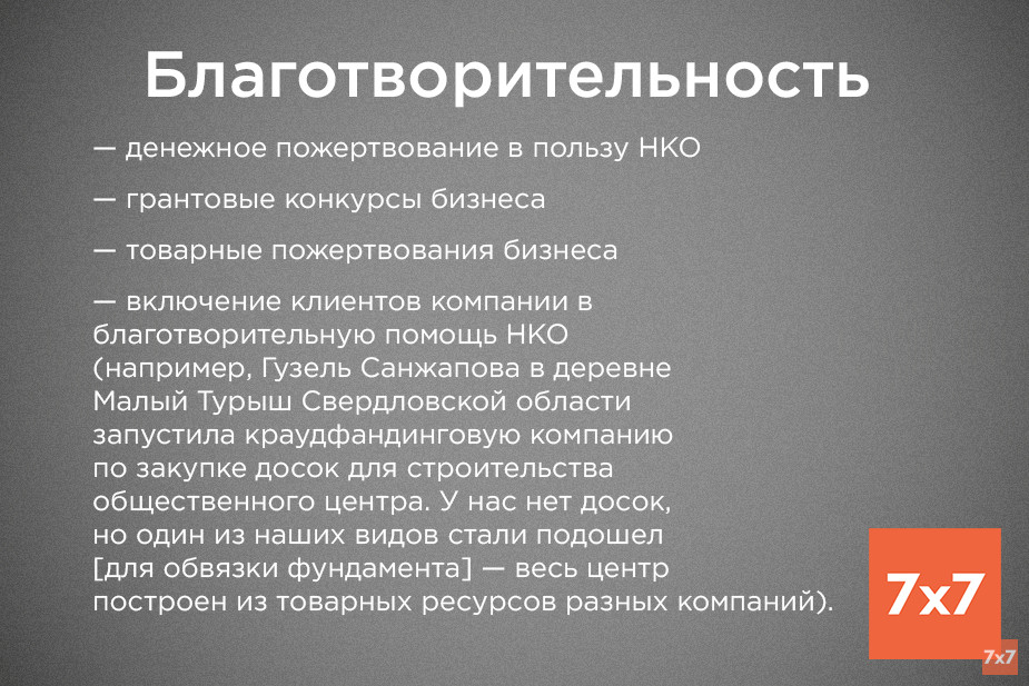 В 2019 году наша компания потратила около 6 млрд на благотворительность. Практически любой бизнес упоминает в своей стратегии развитие местных сообществ. Здесь важно быть более открытыми, не боятся отвечать на вопросы горожан, чаще с ними встречаться, задавать вопросы им, делать проекты, которые нужны жителям. Это движение навстречу друг другу — важный фактор во взаимодействии бизнеса и НКО.