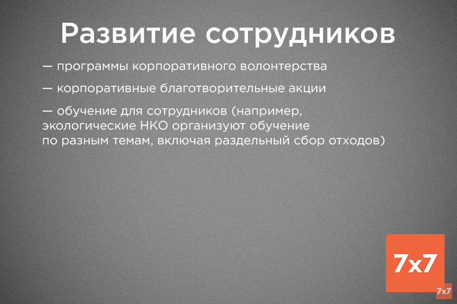 Про доступ к глобальным рынкам. Вы скажете: «У вас 50 тысяч сотрудников работает, а я в НКО, где 10 сотрудников, зачем нам этот доступ к глобальным рынкам?» Мы недавно презентовали отчет об устойчивом развитии, и наш директор по финансам сказал: «Через несколько лет, когда мы будем приходить за ипотекой, возможно, нас будут спрашивать, сортируем ли мы мусор, перечисляем ли деньги на благотворительность, реализуем ли какие-то волонтерские инициативы». Так сейчас инвесторы принимают решения по поводу того, давать ли компании финансирование, особенно если речь о финансировании на льготных условиях.