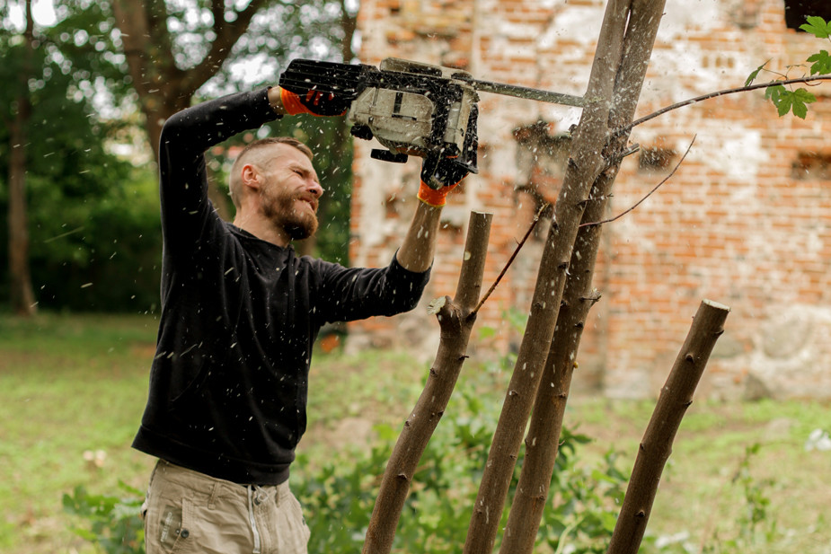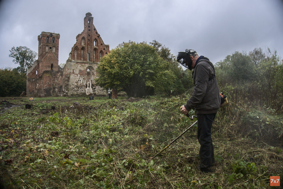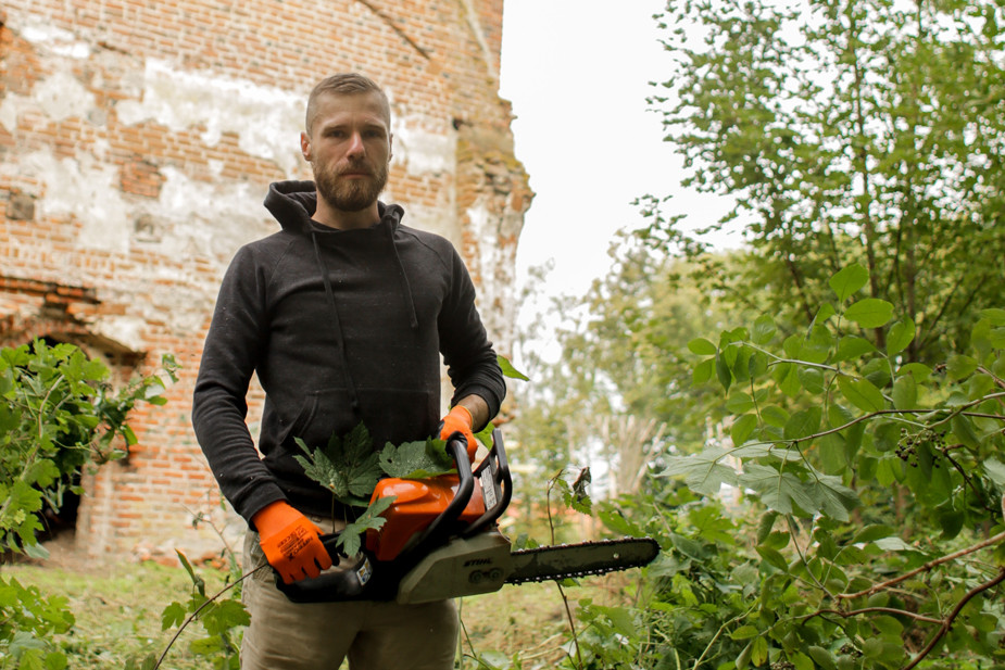 Воскресенье, 11:00, поселок Храброво в получасе езды от Калининграда. На обочине у кирхи Святой Барбары теснится с десяток автомобилей. Дождь льет с раннего утра. Василий Плитин уже не надеялся, что кто-то из волонтеров приедет в такую погоду, но в итоге еле нашел, где припарковать машину. Жужжат электрокосы, люди в дождевиках и резиновых сапогах подрезают кусты, собирают отколовшиеся кирпичи и остатки чьих-то застолий — битые бутылки, консервы, пивные банки.