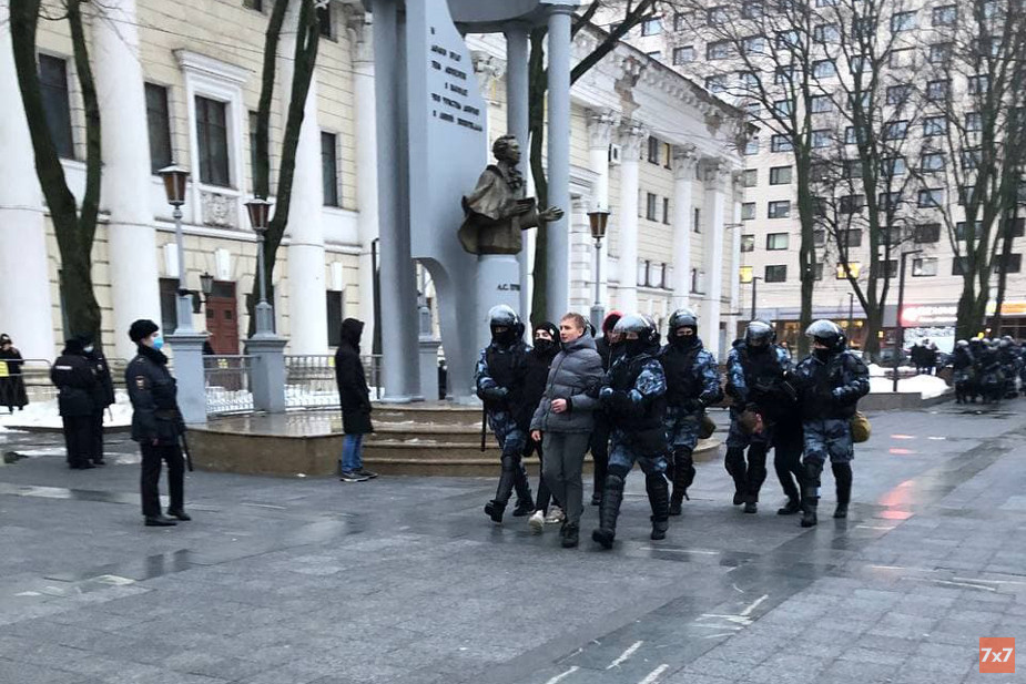 16:08 В Воронеже начались задержания после выступления с мегафоном сторонников Алексея Навального, которые упоминали про аквадискотеку из фильма политика про дворец для Путина. ОМОН выстроился в цепи по шесть-семь человек. Затем силовики начали проникать в толпу, которая стояла на ступенях воронежского театра оперы и балета, и оттеснять людей от театра. Некоторых потащили в пазики. Корреспондент «7х7» сообщает, что с частотой в две-три минуты в пазик отводят по шесть-семь человек. Хватают кого угодно.