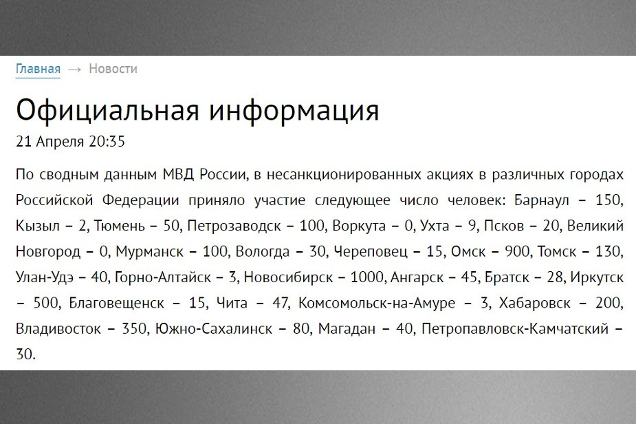 Обновление 12:30. По информации МВД России, в регионах России в протестных митингах 21 апреля поучаствовало около 3,8 тыс. человек.