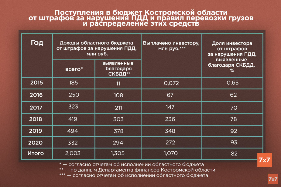 За время действия концессионного соглашения (до 2020 года включительно) в бюджет Костромской области в виде штрафов за нарушение ПДД и весогабаритного контроля поступило чуть более 2 млрд руб. Почти две трети от этой суммы —1,3 млрд руб., — штрафы за нарушения, выявленные с помощью СКБДД. Из них 1,070 млрд руб. (82%) получил концессионер — ЗАО «БДКО» (об этом говорится в ответе департамента финансов на запрос «7x7»), и только 235 млн руб. остались в региональной казне.
