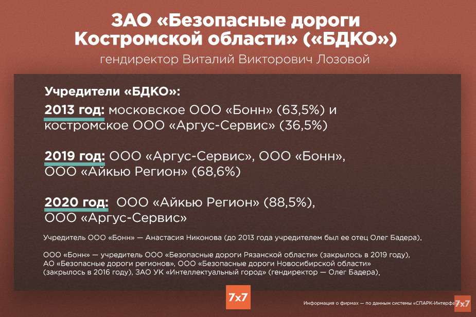 Костромское ЗАО «БДКО» создано в 2013 году, его гендиректор – Виталий Викторович Лозовой. Фирму учредили московское ООО «Бонн» и костромское ООО «Аргус-Сервис». По данным «СПАРК-Интерфакс», долей в ООО «Аргус-Сервис» владеет бюджетное госучреждение «Центр обеспечения мероприятий гражданской обороны, защиты в чрезвычайных ситуациях и обработки вызовов 112». Его учредил Департамент региональной безопасности Костромской области, а возглавляет Юрий Викторович Лозовой.