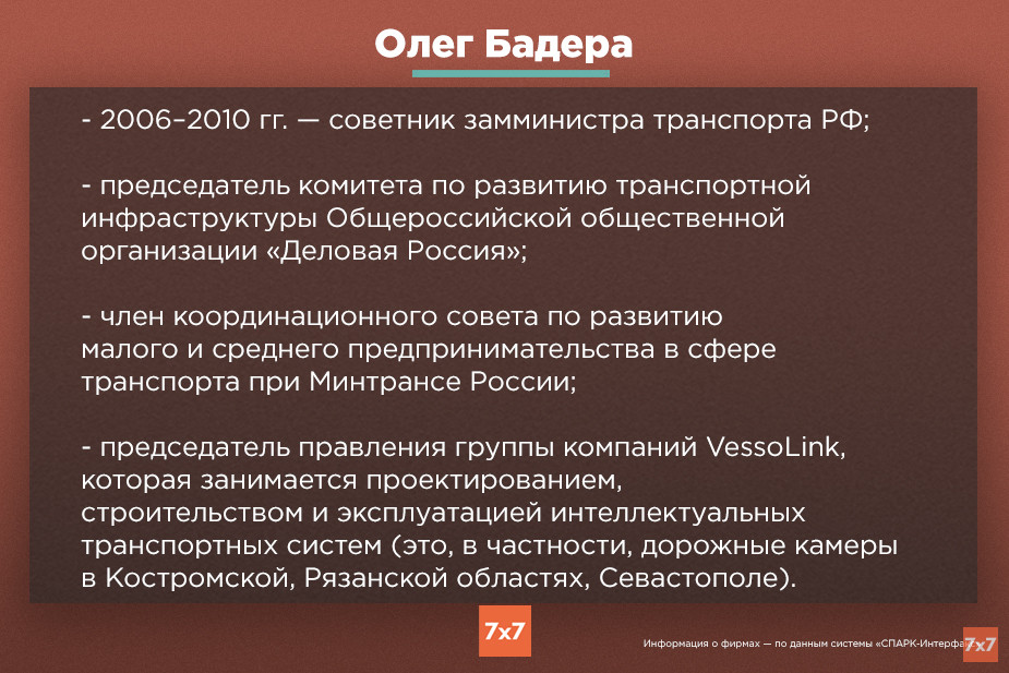 В пояснении к бухгалтерской отчетности ЗАО «БДКО» за 2020 год в системе «СПАРК-Интерфакс» соучредителем компании указано ООО «Айкью Регион» с долей в 88,5%. Учредитель этой фирмы — АО «Проект дороги». Его учредило московское ООО «Вассон Лигал Сервисез», которым владеет кипрская компания Senston Industries Limited. Раньше доля в АО «Проект дороги» принадлежала компании Олега Бадеры «СП Дороги» и ООО «Телематические решения» (торговая марка WAVIoT). Один из учредителей последней — компания «Вавиот интегральные системы», зарегистрированная в США.