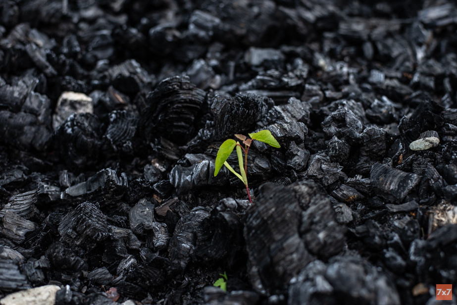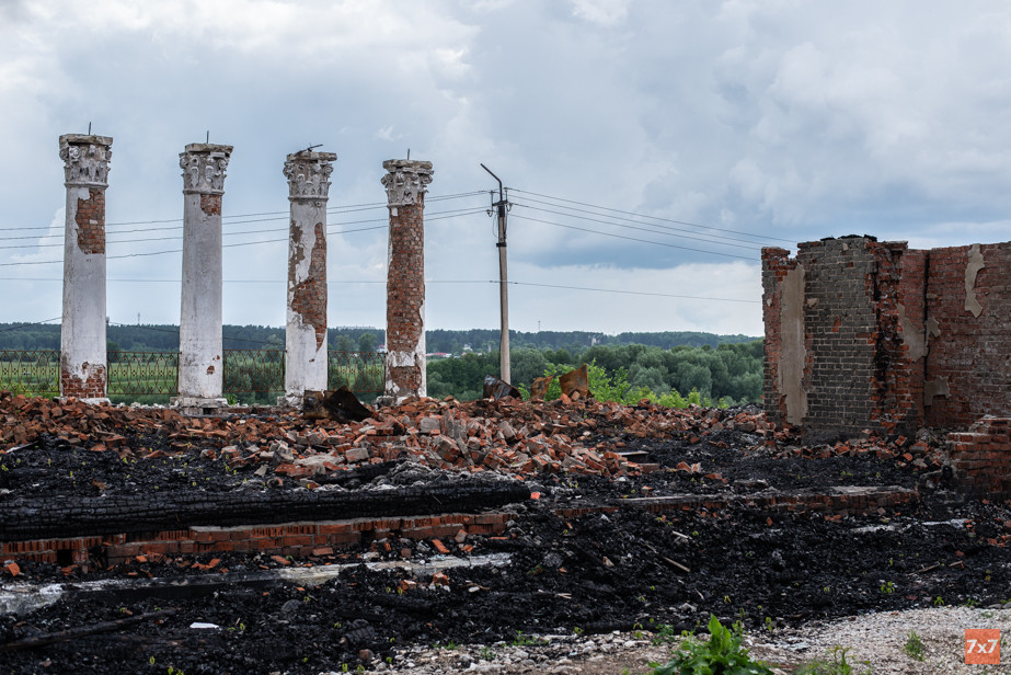 Пепелище — первое «больное место» Касимова, куда видеоблогер привез съемочную группу «7x7». Сквозь головешки пробиваются ростки американского клена — через несколько лет невозможно будет разглядеть руины за этим сорняком.