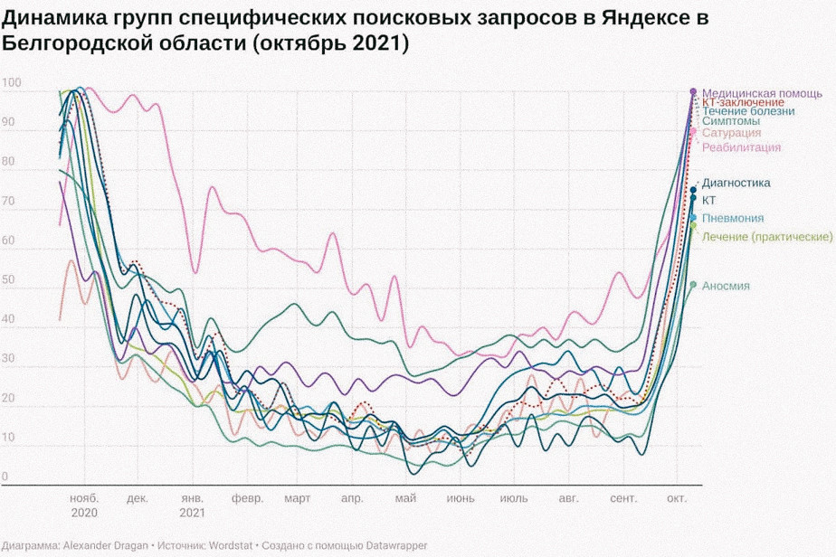 Аналитик открытых данных Александр Драган выяснил, что Белгородская область стала одним из лидеров по доле ковид-специфичных запросов в России. Информацию ищут по запросам «пропало обоняние» или «вызвать скорую». Рост идет сразу по нескольким сотням поисковых запросов в разных тематических группах. В частности, растут как редкие запросы (например, «сатурация на ивл»), так и широкие («пневмония», «компьютерная томография легких»).