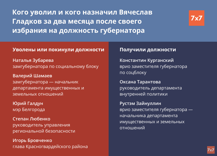 В ноябре 2020 года Владимир Путин назначил врио губернатора Белгородской области Вячеслава Гладкова — чиновника, работавшего в Пензенской области, Ставрополье и Севастополе. Он сменил на посту Евгения Савченко, который управлял регионом 27 лет и выстроил четкую структуру правительства: его заместители сменялись редко и в основном делали карьеру в Белгородской области.
