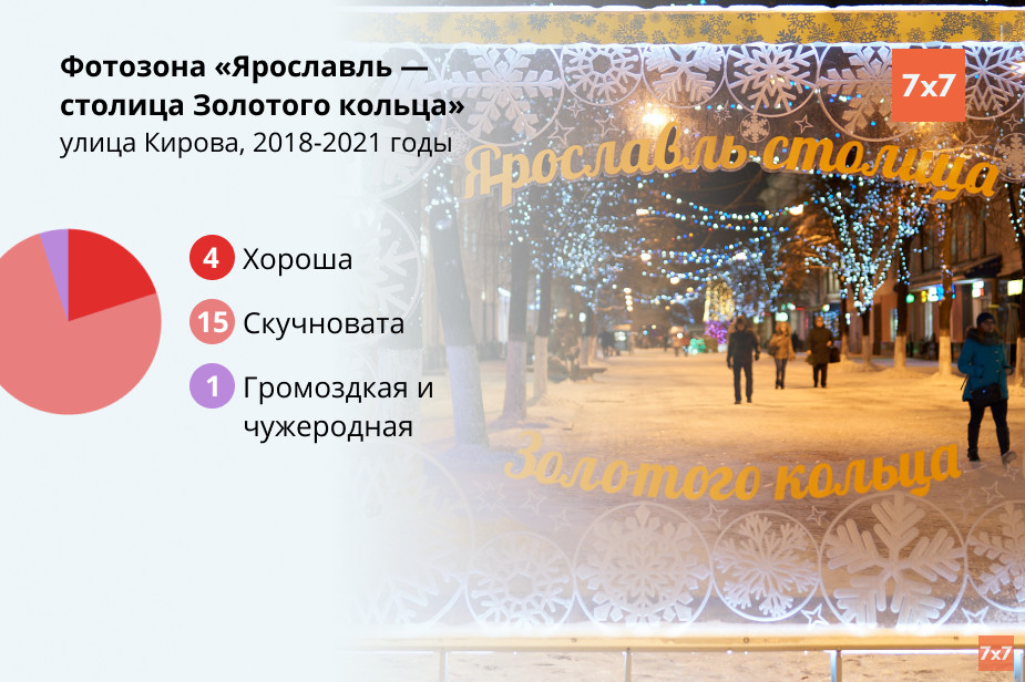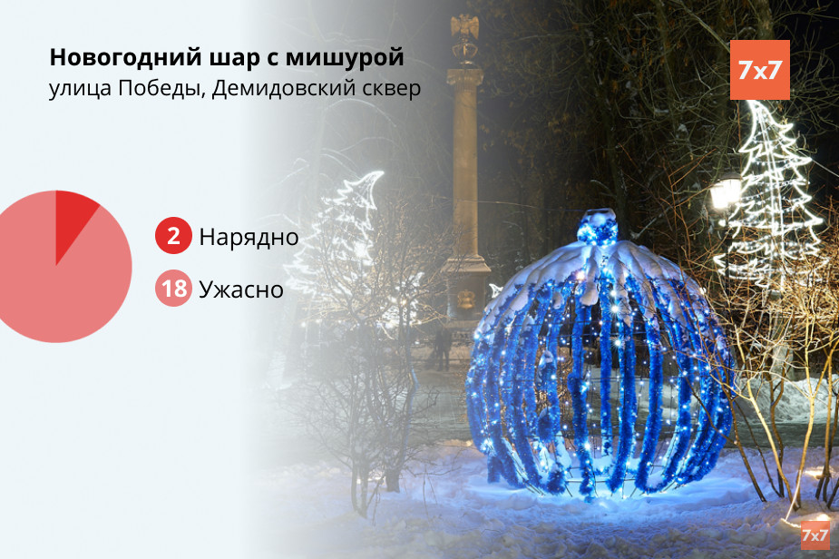 «За что нам такие украшения!» — воскликнула жительница Ярославля Дарья Баунова, проходя по улице Победы. Девушку неприятно поразила праздничная инсталляция «Новогодний шар» — металлический каркас, обтянутый золотистой мишурой. Дарья не одинока в своих чувствах. В соцсетях арт-объект сравнили с туалетом и домиком из «Трех поросят». Журналистка «7х7» проанализировала, какие элементы новогодних декораций Ярославля смотрятся несовременно, а что превратит город в сказку будто с картинок в Instagram.