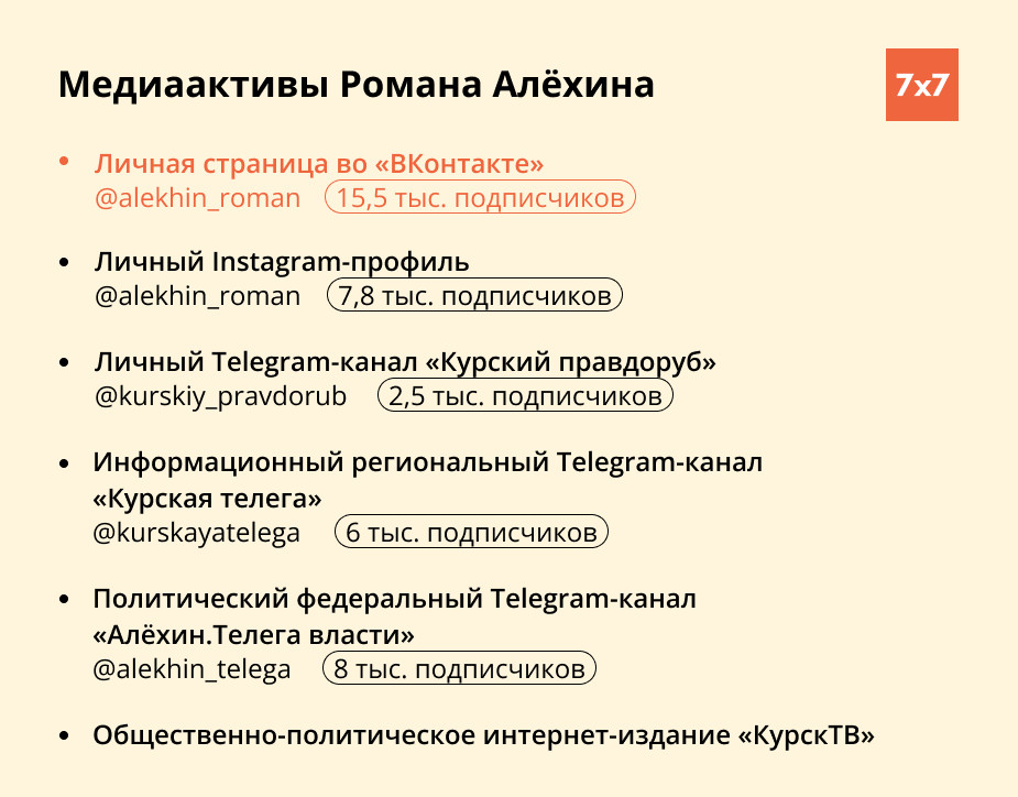 Роман Алёхин из Курска в начале нулевых работал милиционером. Когда начальство попросило его занять сторону рейдеров, он ушел в бизнес. Столкнулся с уголовным преследованием и в попытке защититься обратился к медиа. Так он постепенно стал блогером с большой аудиторией, автором Telegram-каналов и владельцем СМИ. Медиа для Алёхина — инструмент влияния на жизнь в Курской области и работу курских чиновников. В обзоре «7х7» читайте, как посты в соцсетях помогают ему добиваться изменений и почему блогер может быть влиятельнее, чем коллектив профессионального издания.