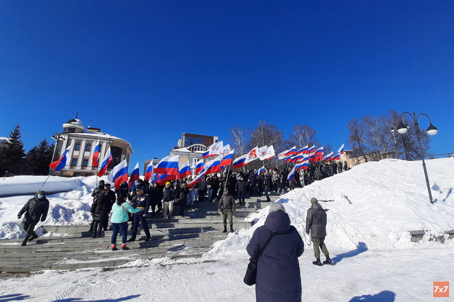 Участники акции «Крымский мост» 16 марта пронесли российские флаги и флаги с лозунгом «Zа Россию» по набережной Грина у Александровского сада и выстроились в живую цепь на спуске. Среди прочих на акцию пришли студенты Вятского государственного агротехнического университета (ВятГАТУ) и кировского филиала РАНХиГС.