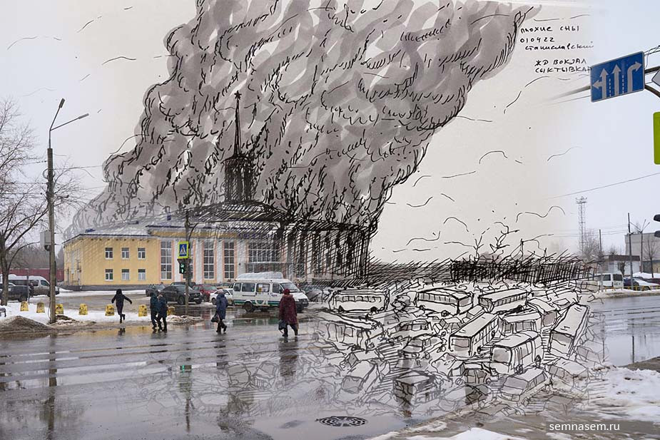 Syktyvkar's landmarks are destroyed; there are many abandoned cars on the roads and no people in the streets. This is how artist Andrei Stanislavsky from Syktyvkar has depicted his hometown in a series of works called, "Bad Dreams". Using his creativity, the artist tries to cope with the events in Ukraine and "step into the situation." 7x7 asked Stanislavsky to provide his drawings for publication and tell their story.