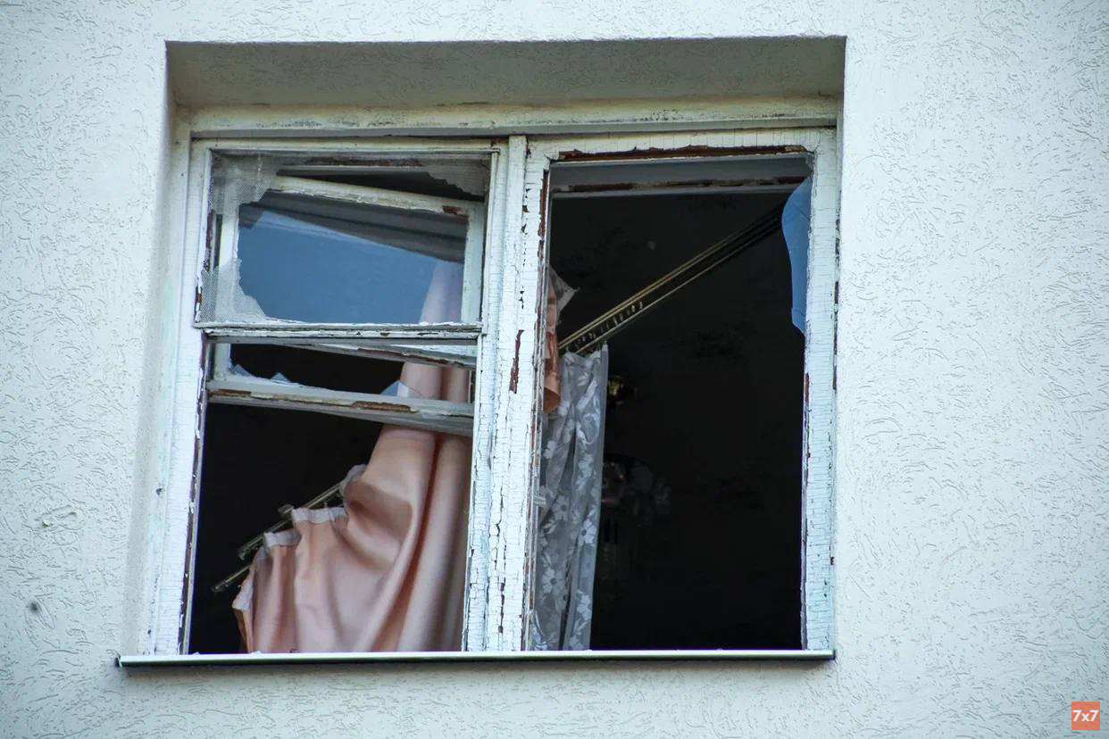 Полицейский «Форд» перекрыл въезд на улицу Маяковского. Во дворе одной из соседних многоэтажек лежит груда треснувших, вырванных с корнем оконных рам. А на первом этаже мужчина с голым торсом оклеивает пластиковой пленкой свой балкон. «Это не мои, — говорит он корреспонденту, кивая на рамы под балконом, — это выше».