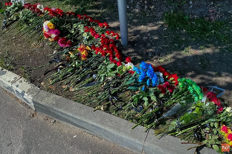 На обочине у выезда с улицы Маяковского в Белгороде лежат охапки живых цветов. Сюда горожане несут их с утра — в память о погибших в результате ночного обстрела.