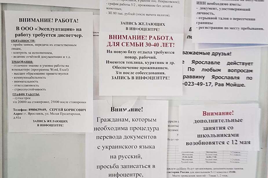 Волонтер Дмитрий выкладывает в чат помощи украинским беженцам в Ярославле фотографию — доску объявлений одного из пунктов временного размещения. На ней среди прочего висят вакансии, например «В ООО „Эксплуатация“ требуется диспетчер». Также ищут поваров, уборщиков. Почему беженок не устраивают предложения о работе, какие есть сложности с трудоустройством и кем они хотят работать в России — в материале «7х7».