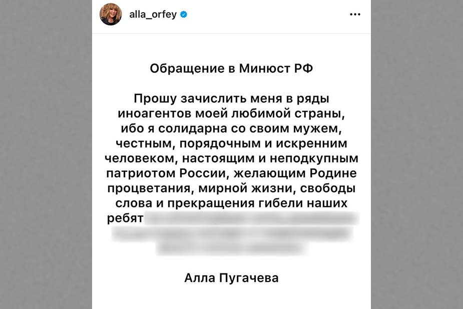 Певица Алла Пугачёва попросила Минюст включить ее в список иноагентов вслед за мужем Максимом Галкиным. Его внесли в реестр 17 сентября. Галкин неоднократно высказывался против военных действий в Украине. Как на ее заявление отреагировали представители власти и общественность — в обзоре блогов «7х7».