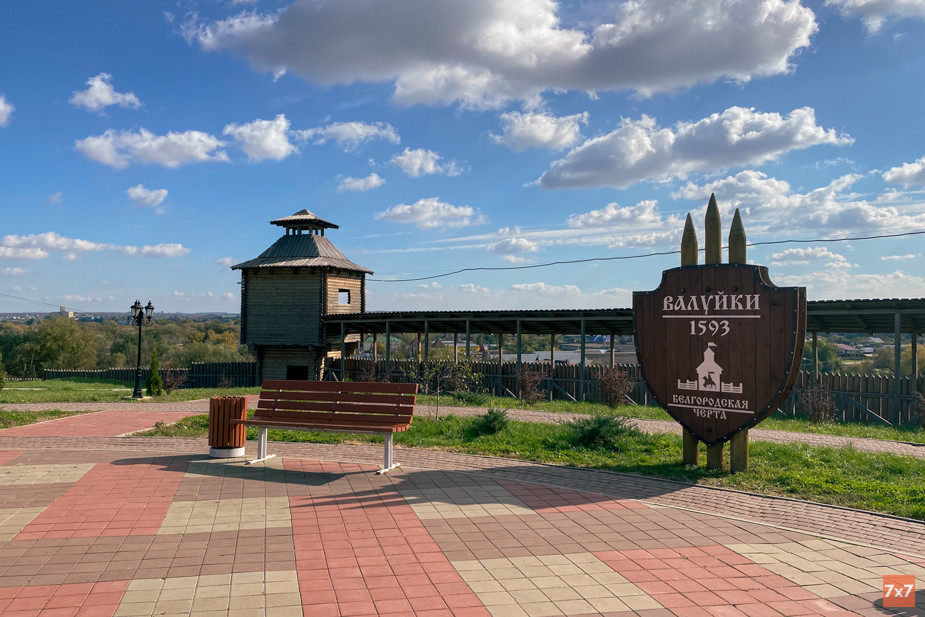 Люди с этой окраинной части города перемещались в центр по делам. 3 км пути, подъем в горку мимо домов с деревянными оконными рамами, автомоек, «Пятерочек» и ларьков с бургерами — и справа от дороги на холме показалась деревянная крепость. В XVII веке жители этих мест построили часть сооружений «Белгородской черты» — крепости для защиты от набегов крымских татар. Теперь на стенах памятника растянуты баннеры с портретом молодого военного и надписью ZOV — эти буквы используют военные. За крепостью начинается центр Валуек.