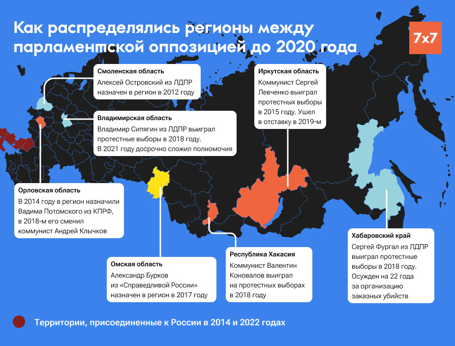 Первой свой «пряник» в виде проблемной для властей Смоленской области получила ЛДПР. Политический корреспондент «Медузы» Андрей Перцев в разговоре с «7x7» сообщил, что регион партии отдали за проявленную лояльность — во время протестов 2011–2012 годов ЛДПР, в отличие от коммунистов и эсэров, не пошла против действующей власти.