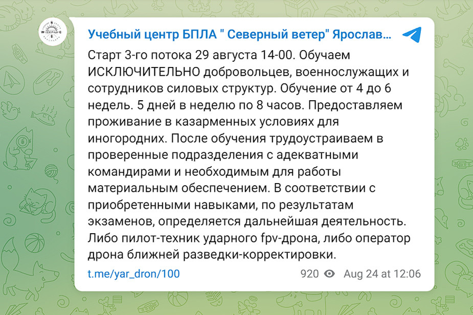 Скриншот из телеграм-канала курсов управления беспилотниками «Северный ветер»
