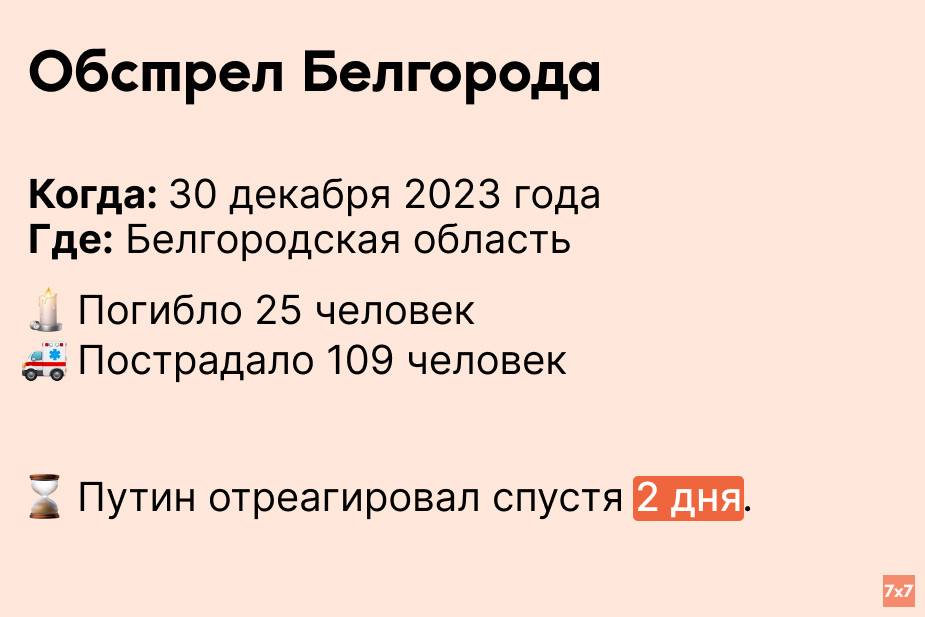 30 декабря украинские вооруженные силы обстреляли Белгород в ответ на массированный ракетный удар ВС РФ накануне. Этот обстрел Белгорода считается одной из сильнейших атак Украины на территорию России с начала войны в 2022 году. Владимир Путин назвал обстрел “терактом”.