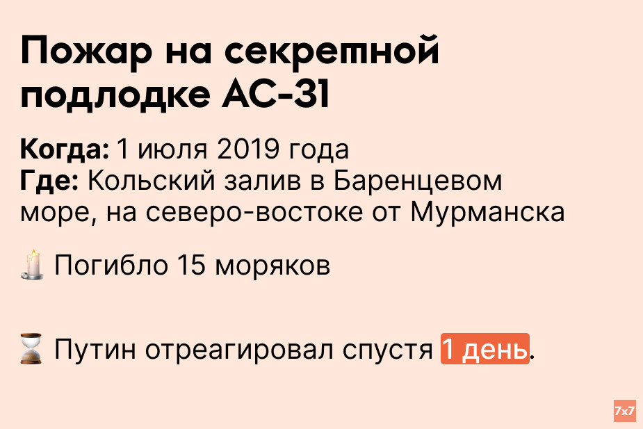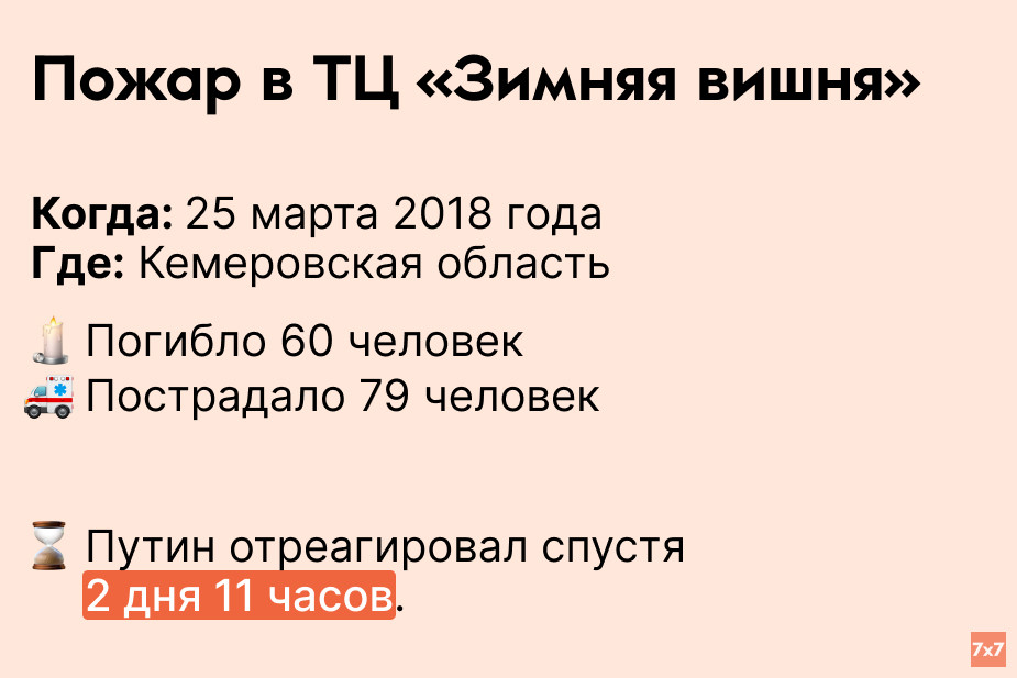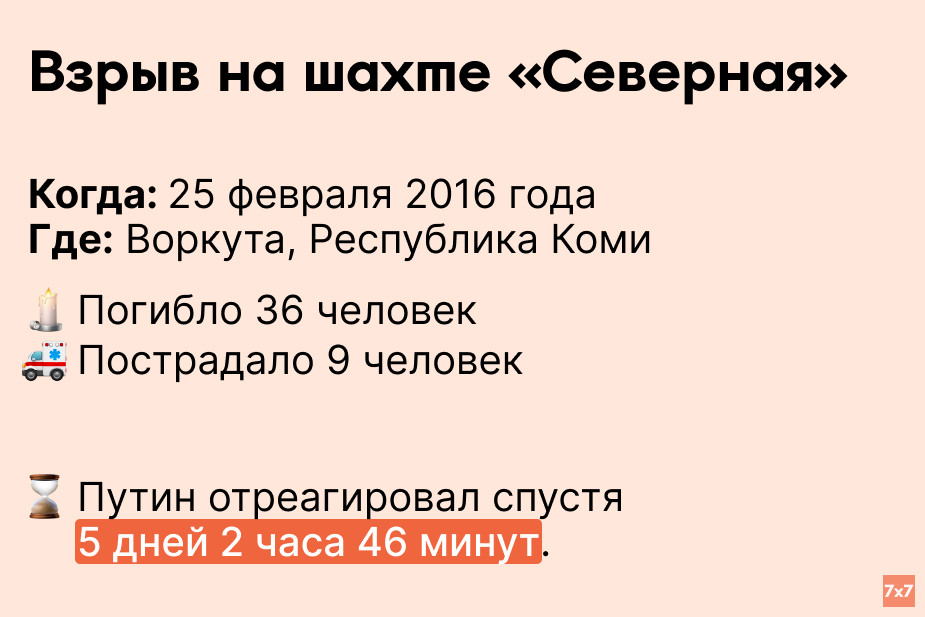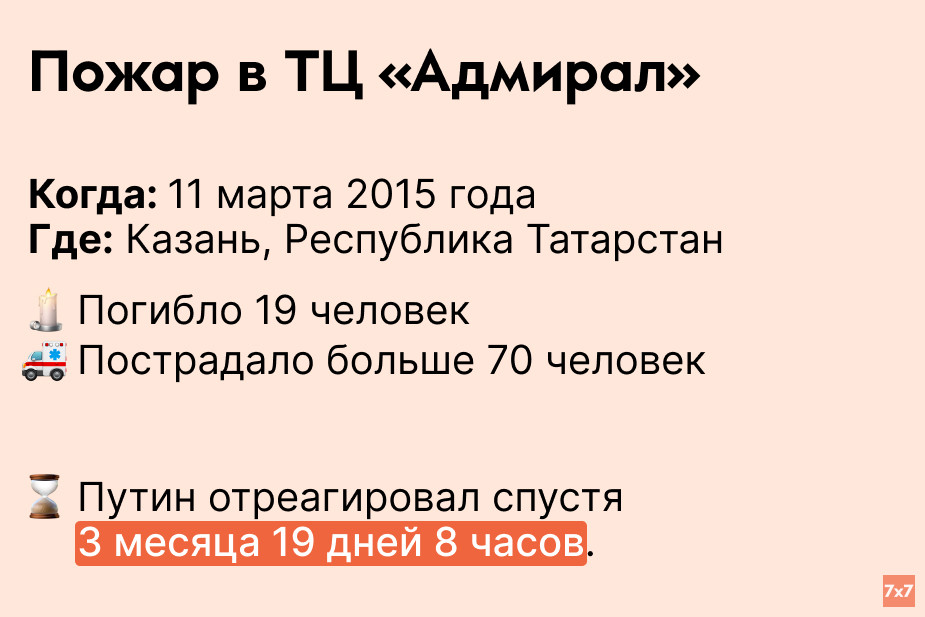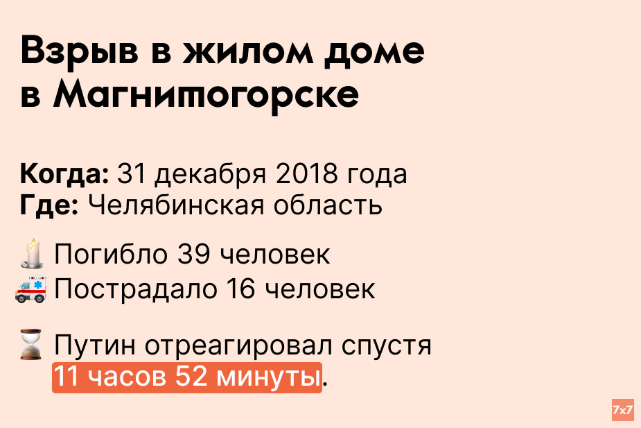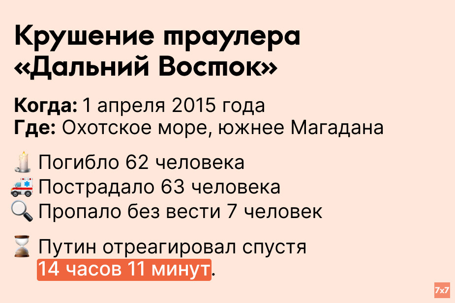«7х7» проанализировал, сколько времени Путин выжидал, прежде чем публично прокомментировать резонансные происшествия последних 9 лет.