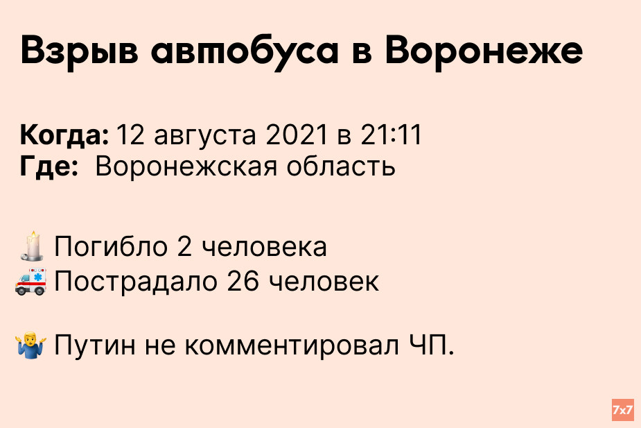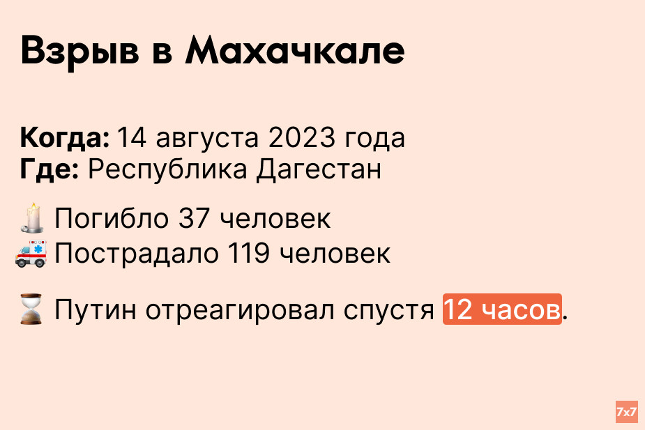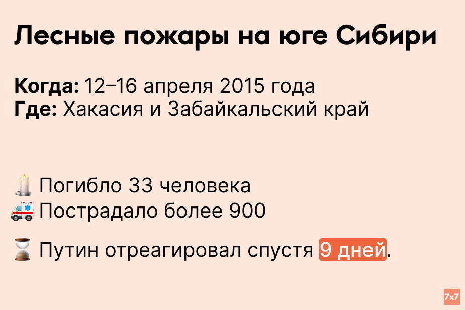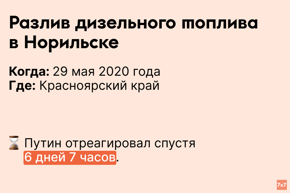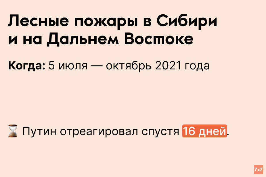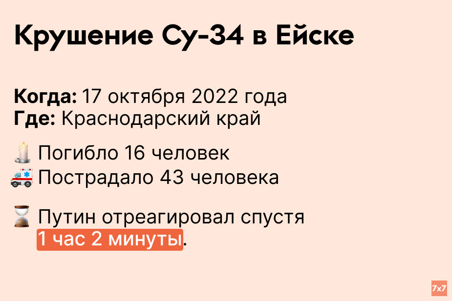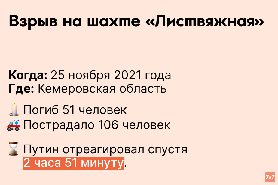 «7х7» проанализировал, сколько времени Путин выжидал, прежде чем публично прокомментировать резонансные происшествия последних 9 лет.