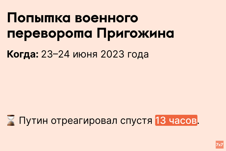 23 июня Евгений Пригожин, глава ЧВК “Вагнер”, заявил, что российские воздушные войска нанесли удар по тылу его формирования. В ответ на это вечером того же дня он анонсировал “марш справедливости” на Москву. В ночь с 23 на 24 июня войска “Вагнера” оставили позиции в Украине и зашли в Ростовскую область. Также они прошли через Воронежскую и Липецкую области. Во время “марша” вагнеровцы сбили один самолет и шесть вертолетов ВС РФ. В ходе переговоров, в которых участвовал Александр Лукашенко, Пригожин решил свернуть поход - ему и его войскам обещали безопасность в Беларуси. Путин в своем обращении назвал марш “мятежом, авантюрой и ножом в спину”. 23 августа 2023 года самолет, в котором летел Пригожин, разбился из-за взрыва на борту.