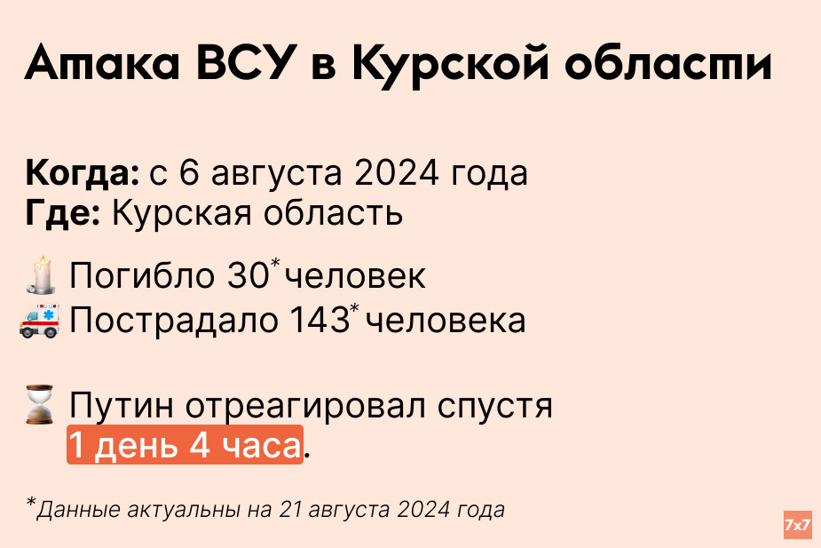 Врио губернатора Курской области Алексей Смирнов сообщил об атаке ВСУ в своем телеграм-канале. На момент публикации вооруженные силы ВСУ все еще находились в Курской области. Путин назвал атаку «масштабной провокацией Киева».