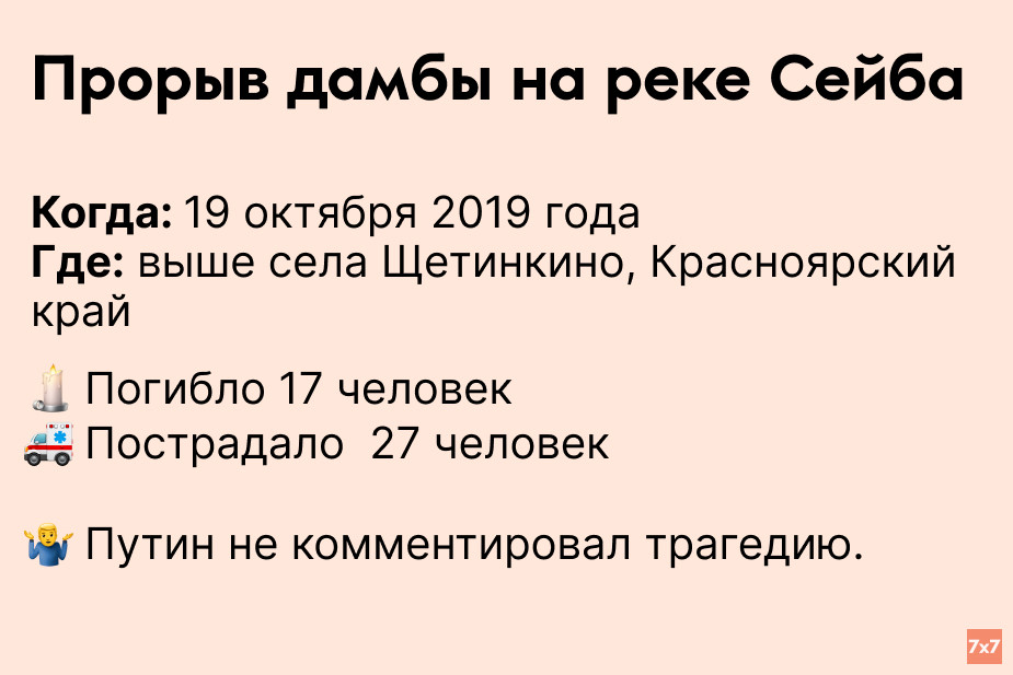 На реке Сейба прорвало дамбу, принадлежащую золотодобывающей компании «Сисим». Этот прорыв спровоцировал разрушение других дамб ниже по течению. Вода и обломки горных пород высотой 4–5 метров неслись по реке, разрушив временный рабочий поселок. Пресс-секретарь Путина Дмитрий Песков рассказал, что президент выслушал доклады об аварии и поручил МЧС и главе региона выяснить причину трагедии, а также помочь пострадавшим. Публично сам Владимир Путин ситуацию не комментировал.