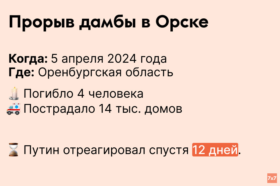 Дамба в Орске не выдержала напор воды, потому что она фактически не была дамбой, ее неправильно содержали и не ремонтировали. Путин прокомментировал потоп на совещании с кабинетом министров. Он потребовал организовать работу над оценкой ущерба “без пауз”.