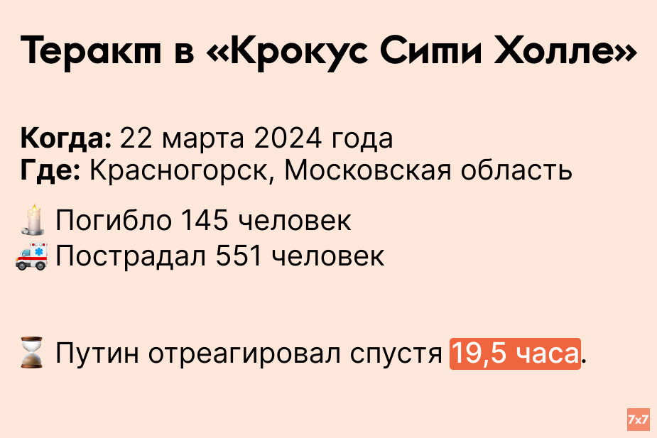 Во время концерта группы “Пикник” несколько террористов вошли в здание концертного зала и начали массовую стрельбу по посетителям и сотрудникам “Крокуса”. Нападавшим удалось покинуть место трагедии. В результате расследования силовики взяли под стражу четырех человек, одному из них показательно отрезали ухо во время задержания. На следующий день Путин выступил с обращением, в котором обвинил Украину в теракте.