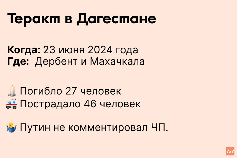 23 июня неизвестные открыли стрельбу в городах Дагестана — Дербенте и Махачкале. Они напали на церкви и синагоги, а также подожгли одну из машин и обстреляли полицейский автомобиль. Местные власти объявили 24–26 июня днями траура. Владимир Путин отказался комментировать события — об этом сообщил его пресс-секретарь Дмитрий Песков.