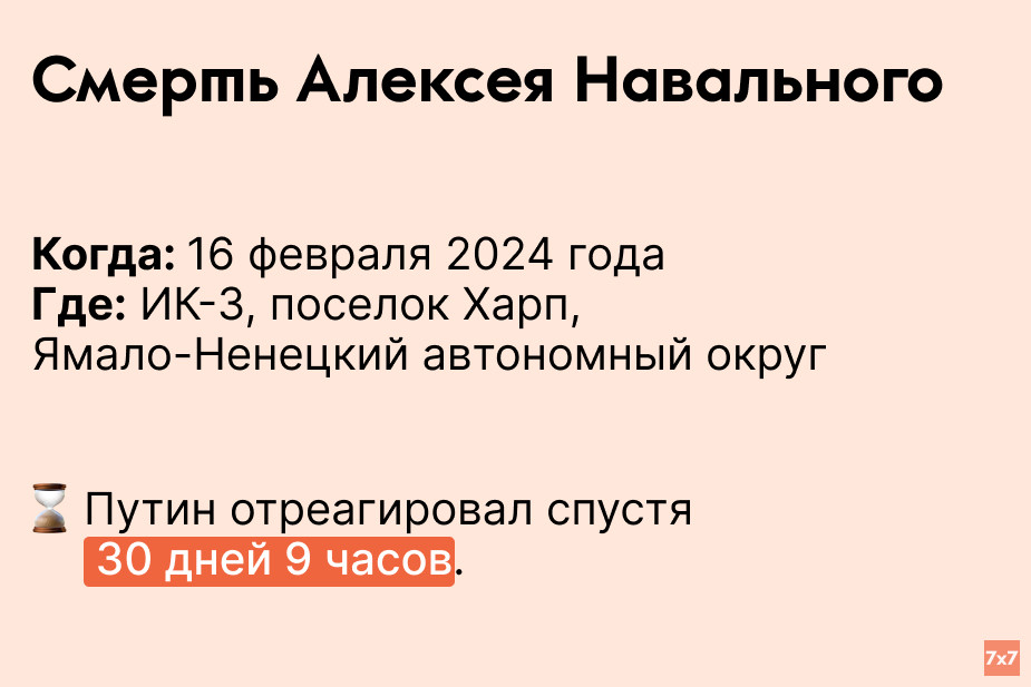 Оппозиционный политик Алексей Навальный скончался в ИК “Полярный волк” в ЯНАО. Его матери Людмиле представители колонии сказали, что он умер от «синдрома внезапной смерти». Соратники Навального считают, что политика намеренно убили, так как ранее команда участвовала в переговорах об обмене Алексея. Владимир Путин прокомментировал смерть Навального, сказав, что это печальное событие, но “так случается”. Он также подтвердил, что согласился на обмен.