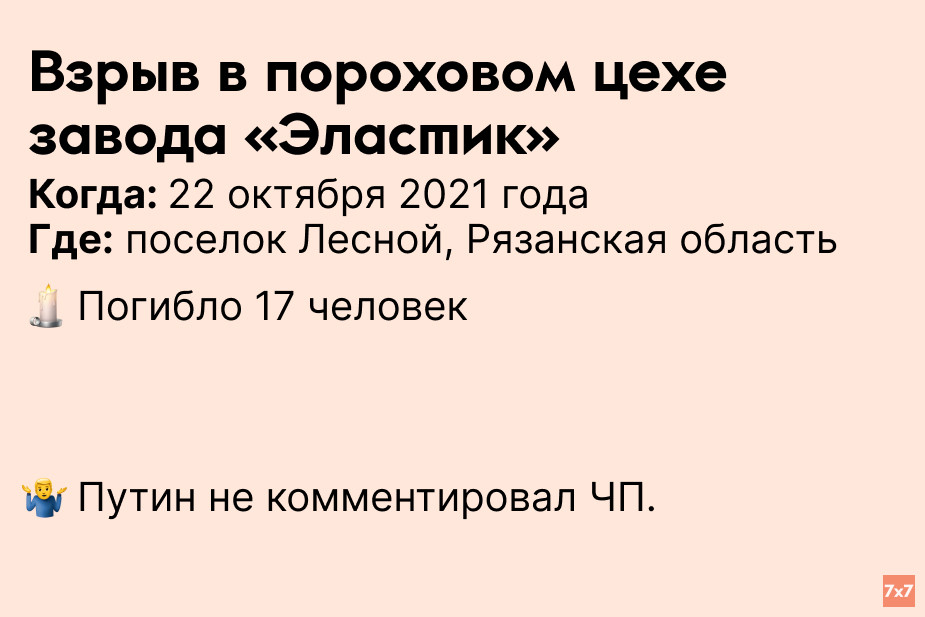 Во время утренней смены на заводе по производству пороха произошел взрыв в одном из цехов. Взрывной волной нескольких работников, разгружавших мешки, отбросило назад. После этого в цехе начался пожар. Причиной взрыва экстренные службы назвали «нарушение технологического процесса» — в частности, специалисты нашли на полу плохо убранные россыпи пороха. Владимир Путин не высказывался о произошедшем.