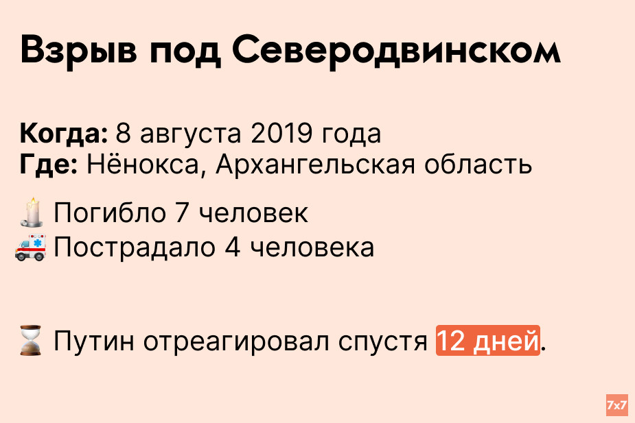 В районе ракетного полигона ВМФ России “Нёнокса” во время испытаний новой техники взорвался жидкостный ракетный двигатель. Из-за взрыва в районе Северодвинска на время повысился радиационный фон. Путин посмертно наградил сотрудников ядерного центра орденами Мужества.