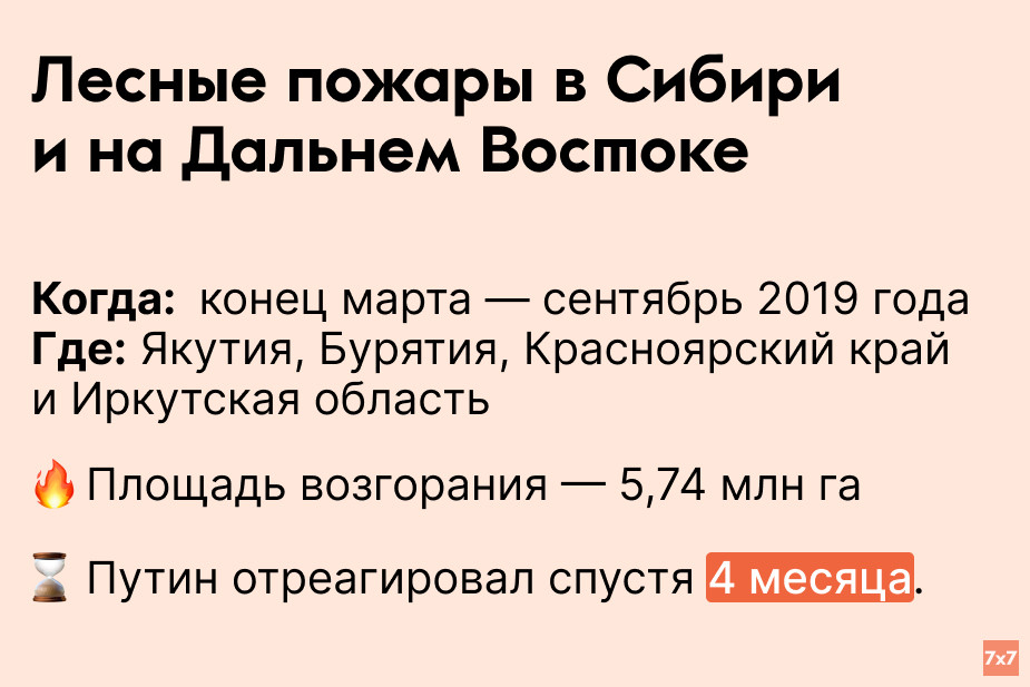 Среди причин пожаров власти назвали жару и засухи, а Гринпис* - нарушение правил противопожарной безопасности на лесозаготовках. Путин сказал, что пожары были неизбежны из-за аномальной жары.