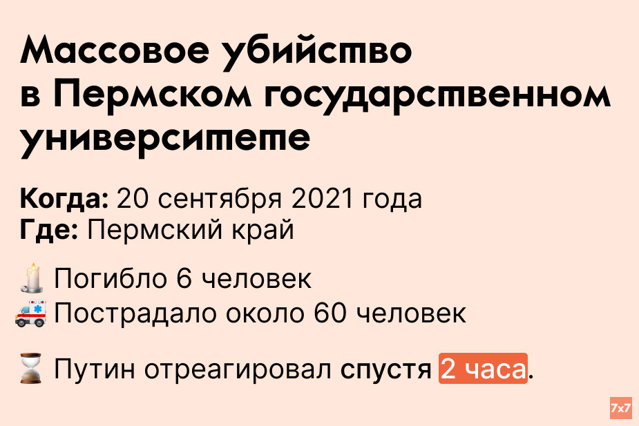 Студент Тимур Бекмансуров пришел в университет с дробовиком и устроил массовую стрельбу. За несколько часов до этого на своей странице во “ВКонтакте” он опубликовал письмо, в котором попросил не причислять его к экстремистским и религиозным организациям. Суд приговорил Бекмансурова к пожизненному заключению. Путин выразил соболезнования семьям погибших и поручил министрам высшего образования и здравоохранения вылететь в Пермь и оказать помощь пострадавшим.