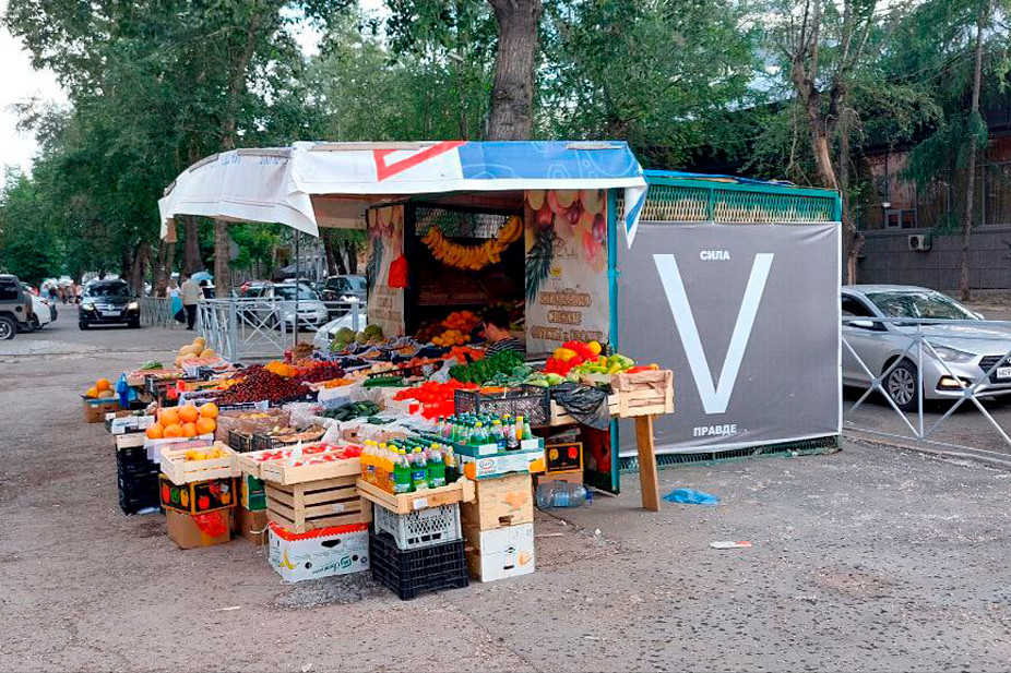 Символы российской армии и войны в Украине на торговых палатках в Новосибирске, июнь 2022 года. Фото: Светлана Каверзина. Источник: vk.com