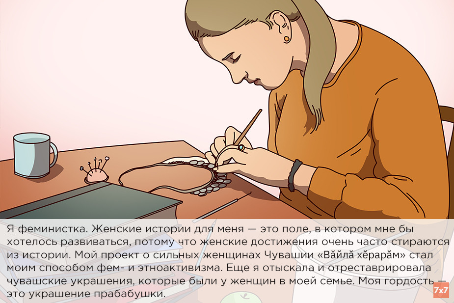 Анна очень долго стыдилась своего чувашского происхождения. И даже радовалась, что обладает «типичной славянской внешностью». Однако, взрослея, девушка стала задаваться вопросом: «Может, быть чувашкой не так страшно?» Переломным стал февраль 2022 года. Она захотела почувствовать свою инаковость, сбежать от «русского мира», напиравшего со всех сторон. Чувашия и чувашская культура дали Анне и убежище, и вдохновение.