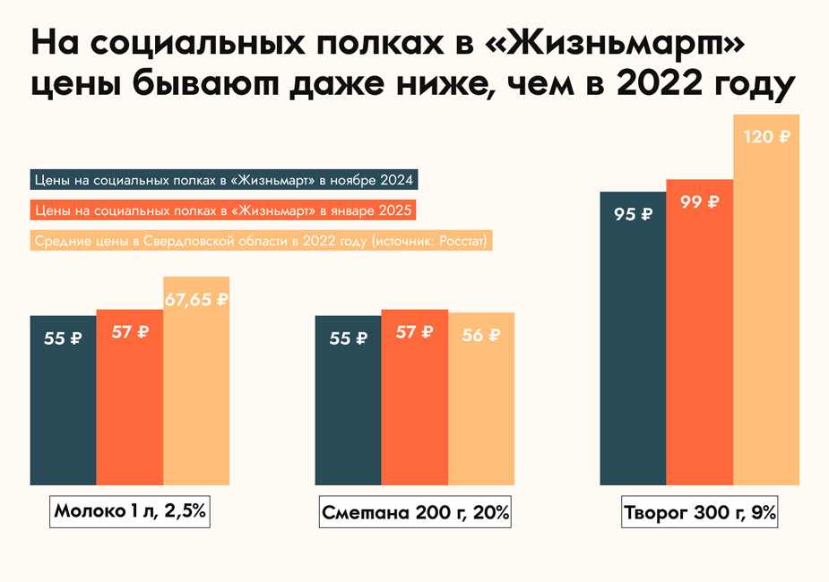 Россия ведет войну в Украине почти три года, и столько же времени дорожает еда во всех регионах страны. По данным Росстата, в 2024 году цены на основные продукты выросли от 8% до 91%. Чтобы поддержать в этой ситуации пенсионеров и малообеспеченных людей, сеть продуктовых магазинов в Екатеринбурге открыла социальные полки. Там можно найти молоко, творог и сметану по довоенным ценам. Корреспондент «7х7» побывал в этих магазинах, проверил, насколько популярны социальные полки, и выяснил, почему продукты в РФ дорожают.