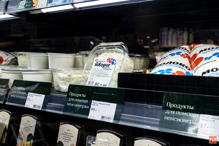 Социальные полки появились в отделах с молочными продуктами. У них на ценниках написано: «Продукты для помощи пенсионерам».