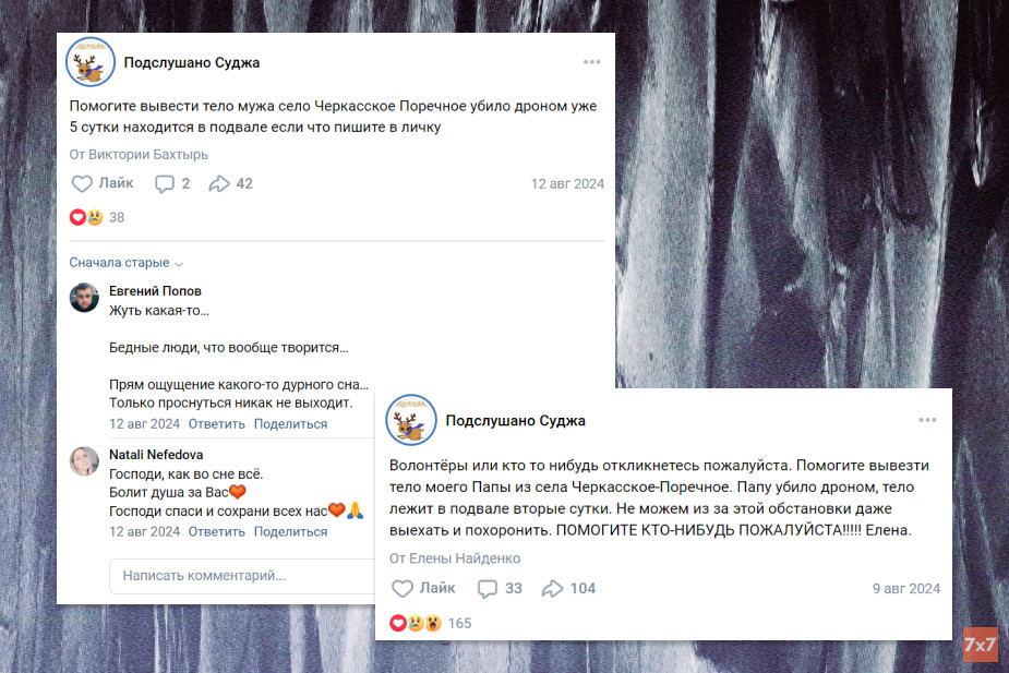 Судя по данным из соцсетей, дочь и жена Бахтыря смогли эвакуироваться из Черкасского Поречного в Курск. Женщины отказались общаться с «7х7», но их родственник рассказал, что в селе оставались «пара человек», и семья надеялась, что они «что-то сделали с телом».