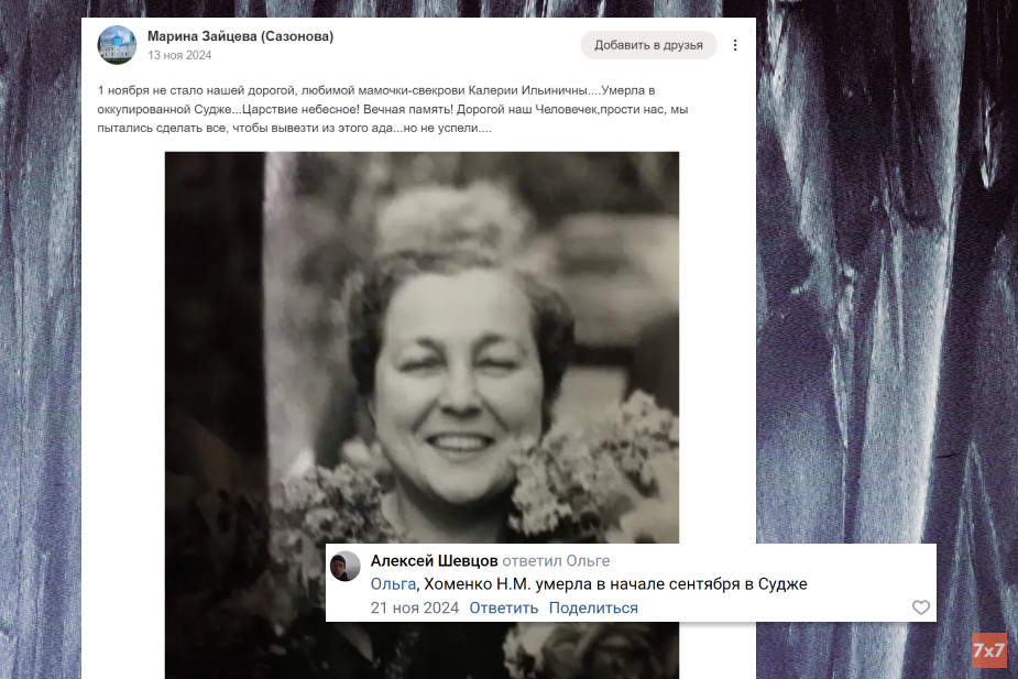 Родные пенсионерки Калерии Момотковой узнали о ее гибели в ноябре 2024 года. По информации «7х7», она скончалась 1 ноября. Невестка Калерии Марина Зайцева рассказала о потере родственницы в соцсетях. Причину смерти 88-летней Момотковой, в прошлом учительницы биологии, она не написала. Корреспондент «7х7» выяснил, что пенсионерка не могла самостоятельно эвакуироваться из захваченной Суджи — к моменту наступления ВСУ она не вставала с кровати. Ее сын и невестка живут в Московской области, поэтому не смогли вывезти женщину.