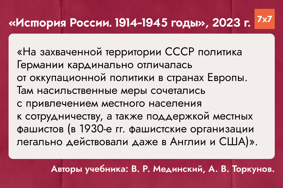 Описание Холокоста в учебнике снова превратилось в рассуждение о геноциде всего «советского народа». Составители написали: «Геноцид мирного населения Советского Союза осуществляли путем создания сотен концлагерей».