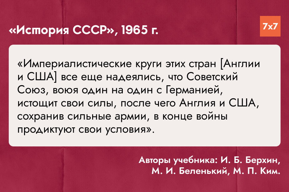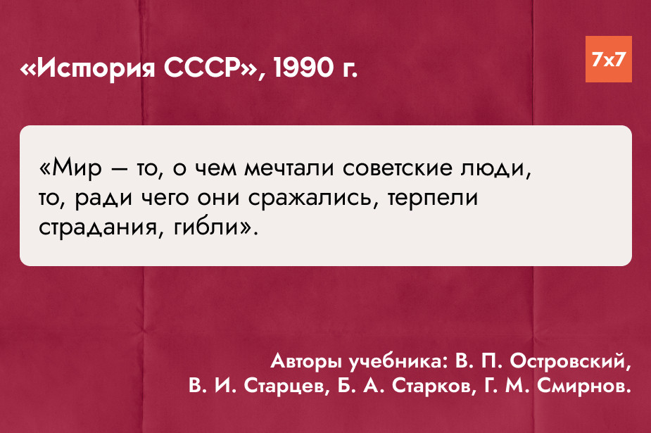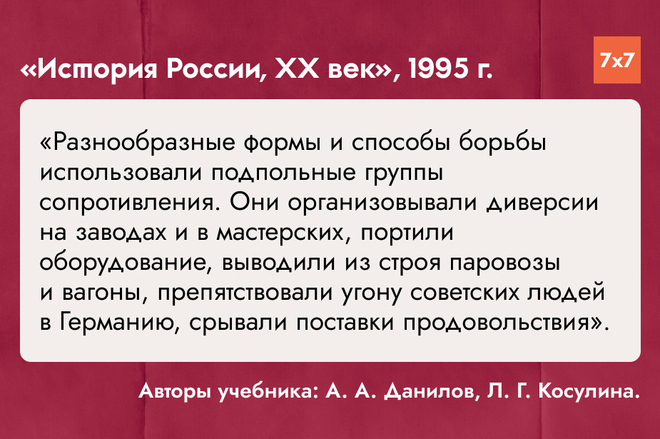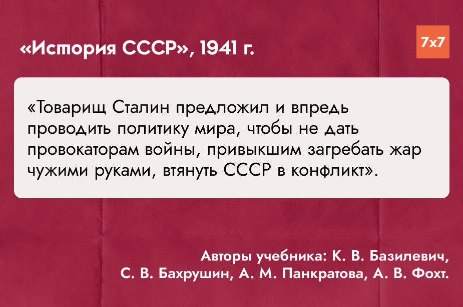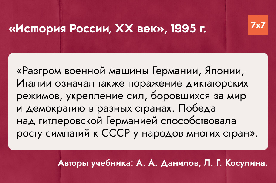 «7х7» проанализировал главы о Великой Отечественной войне в учебниках истории СССР и России для средней школы, выпущенных с 1941 по 2025 год, и попросил историка и руководителя регионального отделения «Мемориала» в Коми Игоря Сажина прокомментировать их содержание. Материал разделен на периоды в зависимости от событий, повлиявших на политический курс СССР и России и отношение государственной пропаганды к событиям 1941-1945 годов.