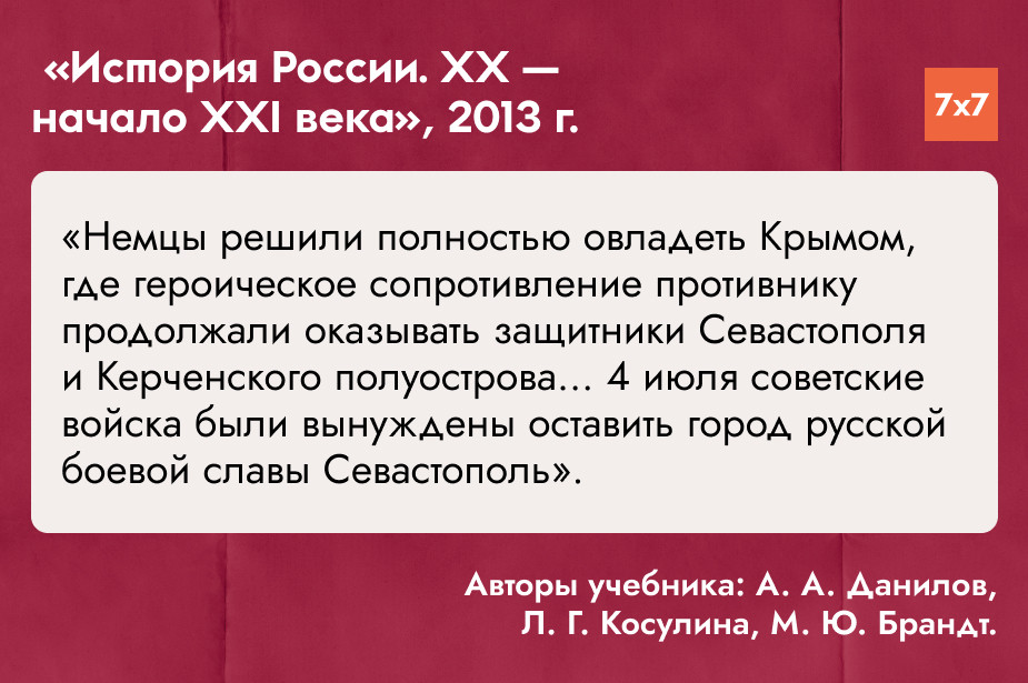 О поражениях СССР в 1941–1942 годах в учебнике ничего нет. Вместо этого говорилось, что Красная Армия «упорно отстаивала каждую пядь советской земли». Потери и оккупированные территории авторы не называли — лишь говорили о населенных пунктах, которые были освобождены к концу 1942 года.