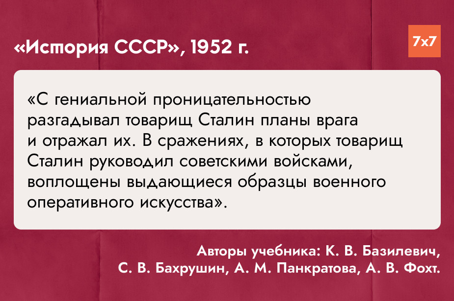 Под авторством ученых, создавших «Историю СССР» в 1941 году, в 1952 году вышел учебник истории для 10 класса. В новом издании авторы приписали Сталину ключевую роль в победе над Германией. По их утверждению, без него СССР проиграл бы войну. Также авторы часто цитируют речи генсека в ноябре 1941 года, которые вдохновили армию и народ на подвиги. Цитаты Сталина приводятся в разделах о Сталинградской битве, битве за Москву и обороне Одессы.