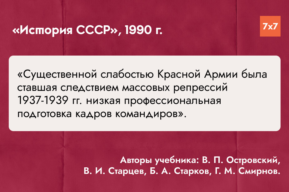 Одним из часто используемых в школах учебников истории с середины 1990-х годов был учебник Александра Данилова. В отличие от пособий перестроечного времени, в нем не связывали провалы Красной армии с репрессиями.