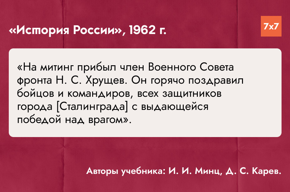Если до 1956 года авторы учебных пособий с восхищением цитировали Сталина, то в 1960-е они добавили небольшое упоминание Никиты Хрущёва, поздравившего защитников Сталинграда после битвы.