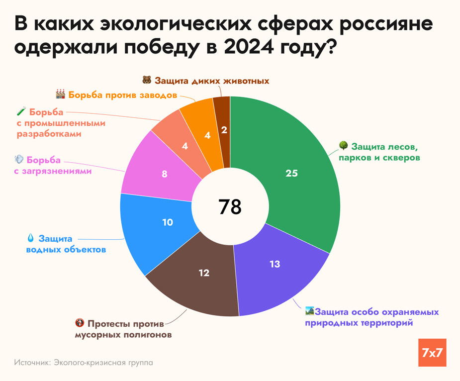 Экологи и неравнодушные граждане по всей России одержали 78 экопобед в 2024 году — от спасения лесов до остановки вредных стройпроектов. Эколого-кризисная группа собирала данные весь год: по публикациям в СМИ, через анонимные чаты и личные контакты. «7х7» выбрал шесть побед — самых необычных и вдохновляющих. Каждой мы дали свою номинацию: как в Книге рекордов Гиннесса, только вместо трюков — реальные примеры того, как общественная солидарность меняет реальность.