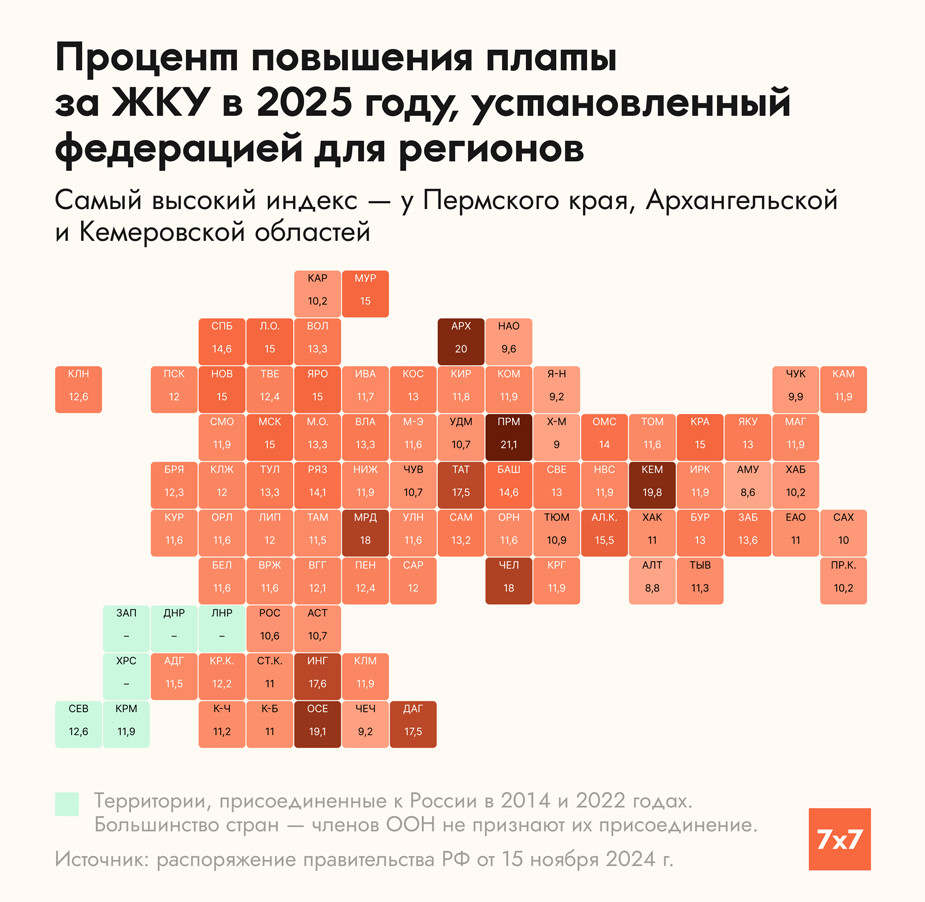 Например, в Новосибирской области с 1 июля 2025 года установлен индекс 11,9%, а допустимое отклонение — 4,8%. Это означает, что в отдельных муниципалитетах плата может увеличиться до 16,7%. При этом среднее значение по региону не должно превышать 11,9%. Если руководители субъекта хотят изменить индекс, они должны обосновать это Антимонопольной службе и получить согласование. Для дальнейших подсчетов “7х7” ориентировался только на индексы 2025 года, установленные федеральным правительством.